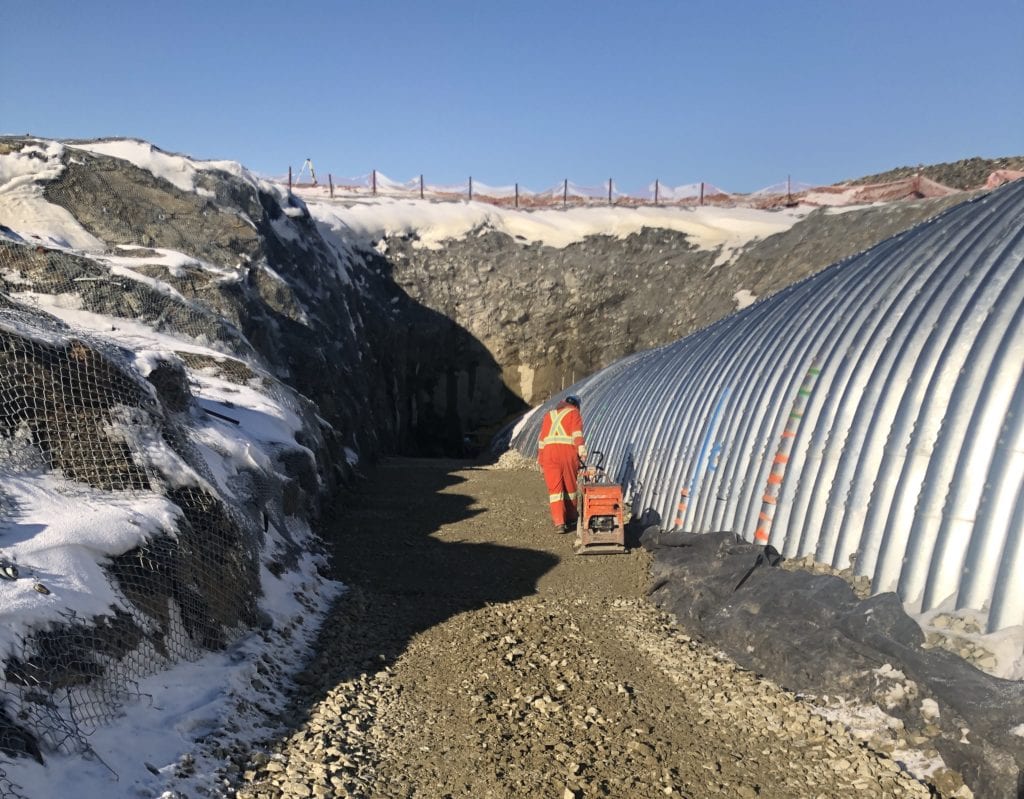 A recently completed Super-Cor Structural Steel Plate portal is just one of several infrastructure solutions AIL Mining has designed and supplied for this Northern Quebec mine site over the last 10 years. Other projects have included multiple vent raise structures, an MSE retaining wall for a portable crusher and various Corrugated Steel Pipe drainage solutions.